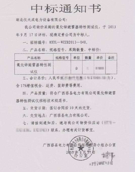 主題詞:廣西容縣電力 廣西水利電業(yè)集團(tuán) 儀天成電力氧化鋅避雷器 中標(biāo)通知書