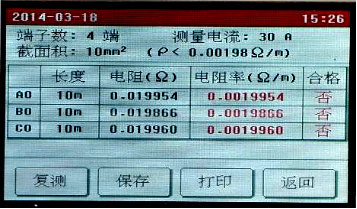 點(diǎn)擊需要修改的參數(shù)設(shè)置框設(shè)置參數(shù),全部設(shè)置完成后點(diǎn)擊“開(kāi)始”按鈕,儀器即按照設(shè)置的參數(shù)開(kāi)始自動(dòng)測(cè)量各端子的電阻值,并計(jì)算電阻率,自動(dòng)判斷接地線(xiàn)是否合格。
