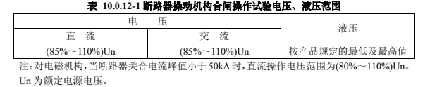 1)當操作電壓、液壓在表 10.0.12-1 范圍內(nèi)時,操動機構(gòu)應可靠動作