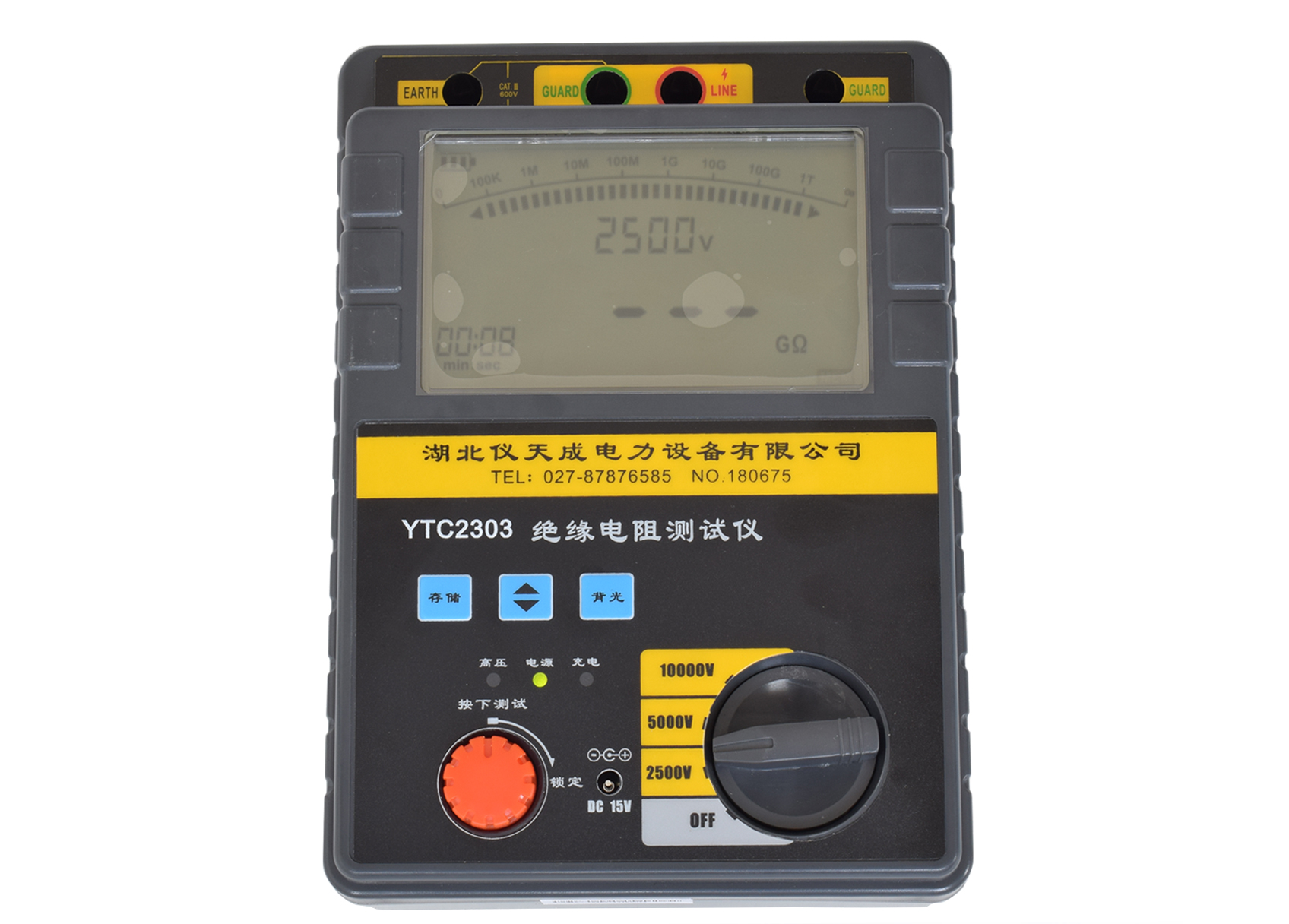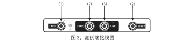 3、將帶高壓測試線紅色插頭端插入(3)LINE端,綠色插頭端插入(2)GUARD端,另一端探針或夾子接于被試設(shè)備的高壓導(dǎo)體上。將測試線副線(綠色)插入(2)GUARD端(右手邊),另一端接于被試設(shè)備的高壓護(hù)環(huán)上,以消除表面泄漏電流的影響(詳見“屏蔽端的使用方法”相關(guān)內(nèi)容。將另外一根黑色副線測試線插入地端(EARTH)(1)端,另一頭接于被試設(shè)備的外殼或地上。