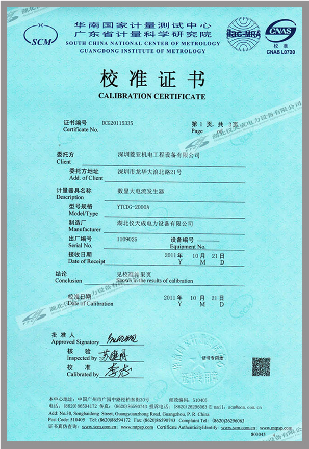 YTCDG系列大電流發(fā)生器鑒定證書(shū)